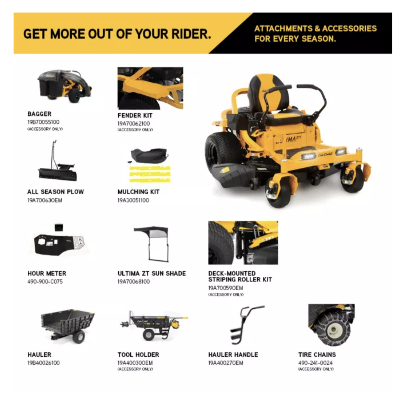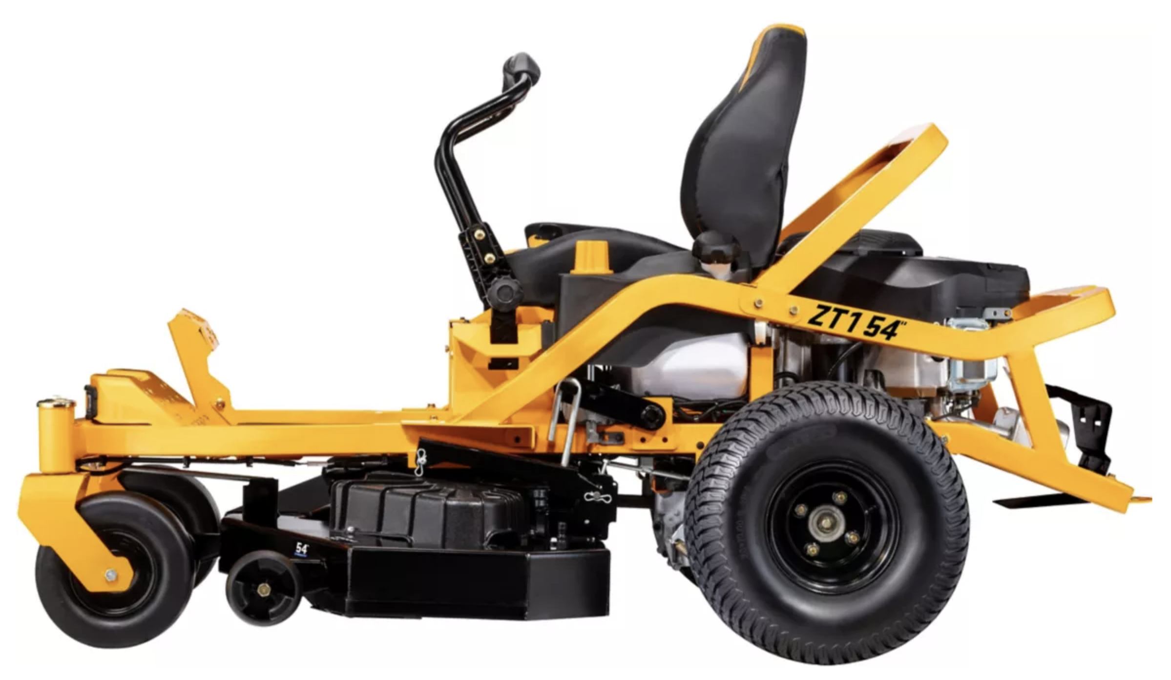 Imagine taking charge of your yard with the Cub Cadet Ultima ZT1-54, your ultimate companion for taming the terrain. This powerful beast boasts a 24HP/725cc Kohler 7000 Series V-Twin engine that packs a punch while keeping your ride smooth. Imagine fewer clumps and stragglers, thanks to the fifty-four inch fabricated triple-blade deck that delivers a pristine cut every time. With a lifetime warranty on the deck, you know this zero-turn mower is engineered to last.Whether you’re navigating slight hills or conquering obstacles across up to four acres, the dual Hydro-Gear 2200 drive system gives you the torque and speed (up to seven miles per hour) you need to get the job done swiftly. Plus, the high-strength tubular frame and triple guard corrosion defense system ensure this gas-powered riding mower stands up to the rigors of outdoor life.Comfort isn’t an afterthought here-an eighteen inch high back seat with advanced polymer suspension and ergonomic hand grips keep you cozy while you mow. And let’s talk about those wheels-pivoting front wheels and turf-friendly rear tires mean your lawn stays pristine, even at higher speeds. Need to mow in low light? Dual-LED headlights have you covered.Maintenance is a breeze with the open frame design and removable floor pan, giving you easy access to the deck and engine. Plus, the 3.5-gallon fuel tank keeps you mowing longer without frequent stops. And hey, no need to squint at complicated controls-the command center is right where you need it, making everything from blade engagement to deck height adjustments a cinch.With a three-year unlimited-hour warranty and a lifetime warranty on the frame, this zero-turn mower is ready to be your trusty companion for the long haul.