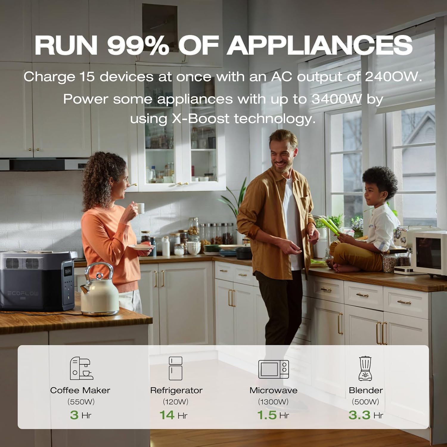 - Up to 3400W Continuous X-Boost Mode – Power 99% of Appliances – With an impressive 3400W X-Boost output, this portable power station easily runs high-demand appliances like fridges, microwaves, and even power tools. From emergency backup to RV adventures, enjoy peace of mind knowing your essentials stay powered without overload.