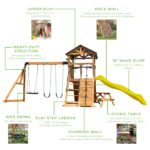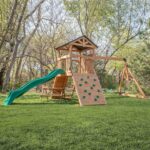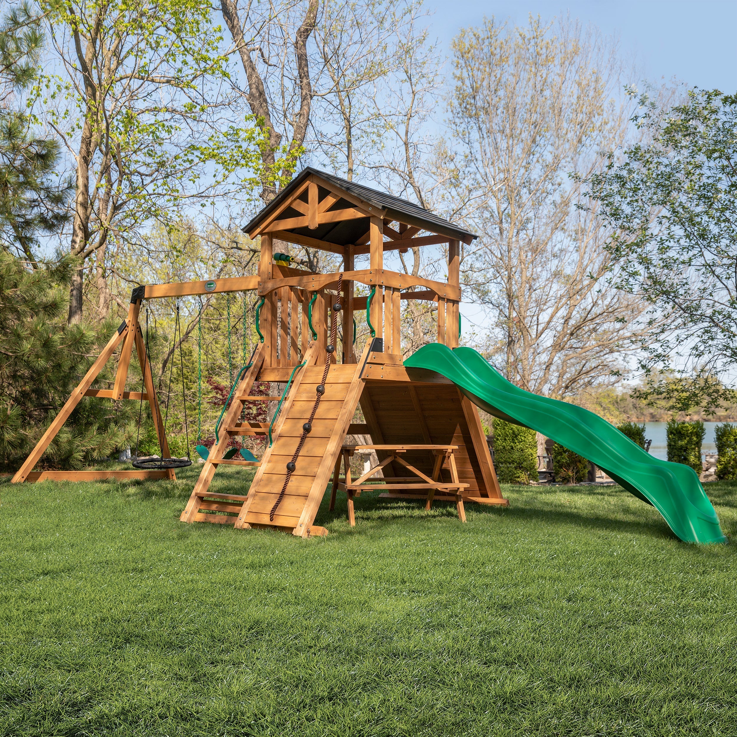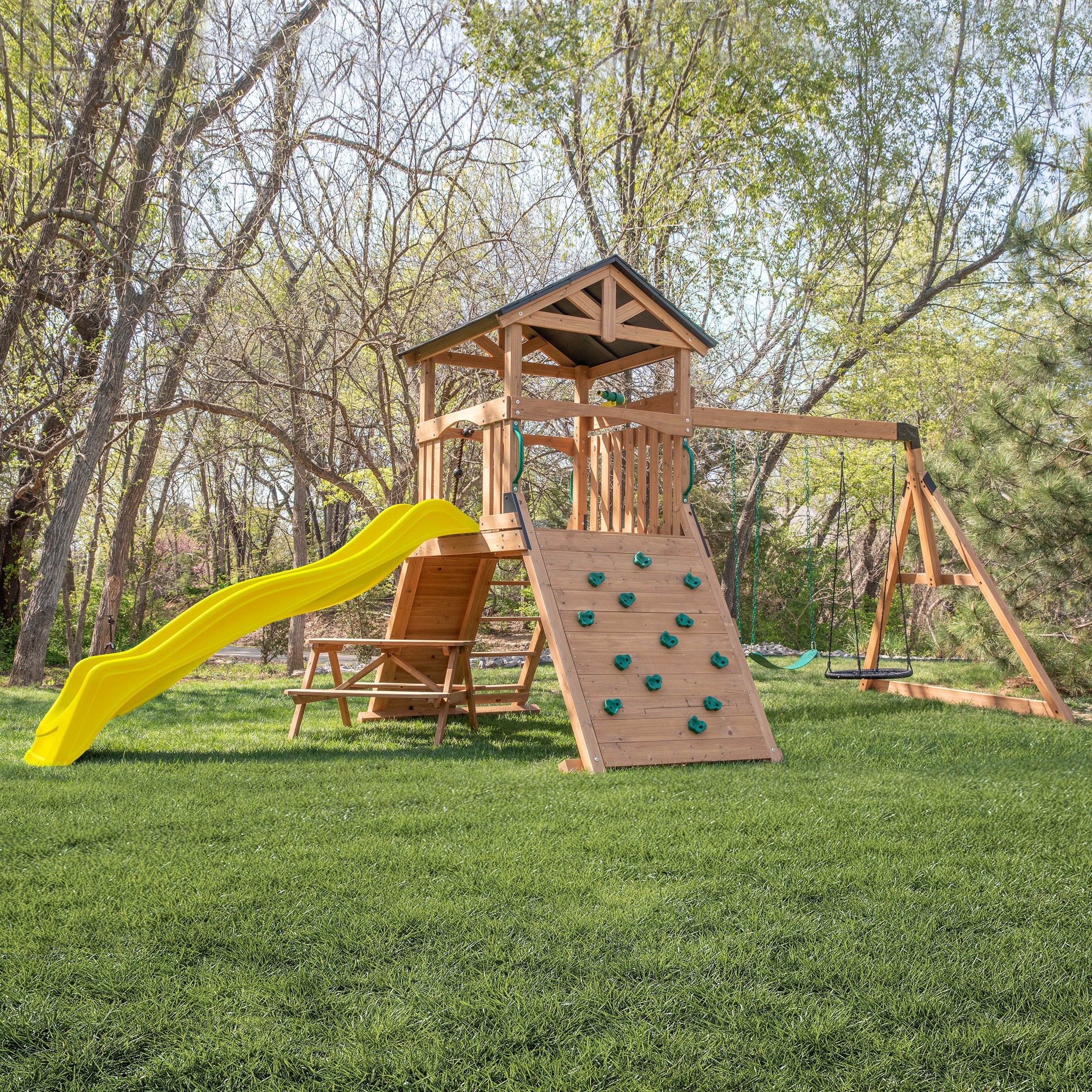 Backyard Discovery’s Endeavor II Swing Set transforms ordinary outdoor spaces into an exciting play station. This wooden swing set invites young explorers to climb, imagine, and discover through thoughtfully designed play features that deliver playful experience. Adventurers can conquer three unique climbing paths, each offering its own exciting challenge. A flat climbing wall with a rope assist provides a secure route for building confidence, while the extra-wide rock wall with 13 challenging holds promises a thrilling ascent to the deck above. The easy-access step ladder features metal handles and wide rungs, perfect for kids of various ages. The elevated deck becomes a secret command center, complete with a toy telescope that turns ordinary backyards into imaginative worlds. The included picnic table with bench seating offers a perfect base camp for snack breaks and creative play. When it’s time for excitement, kids can zoom down the 10-foot wave slide, swing together on two belt swings, or soar to their heart’s content on the web disc swing. Crafted from premium cedar, this wooden swing set is built to withstand countless adventures. With a ready-to-assemble design and BILT® app guided instructions, parents can easily transform their backyard into a playground of endless possibilities.