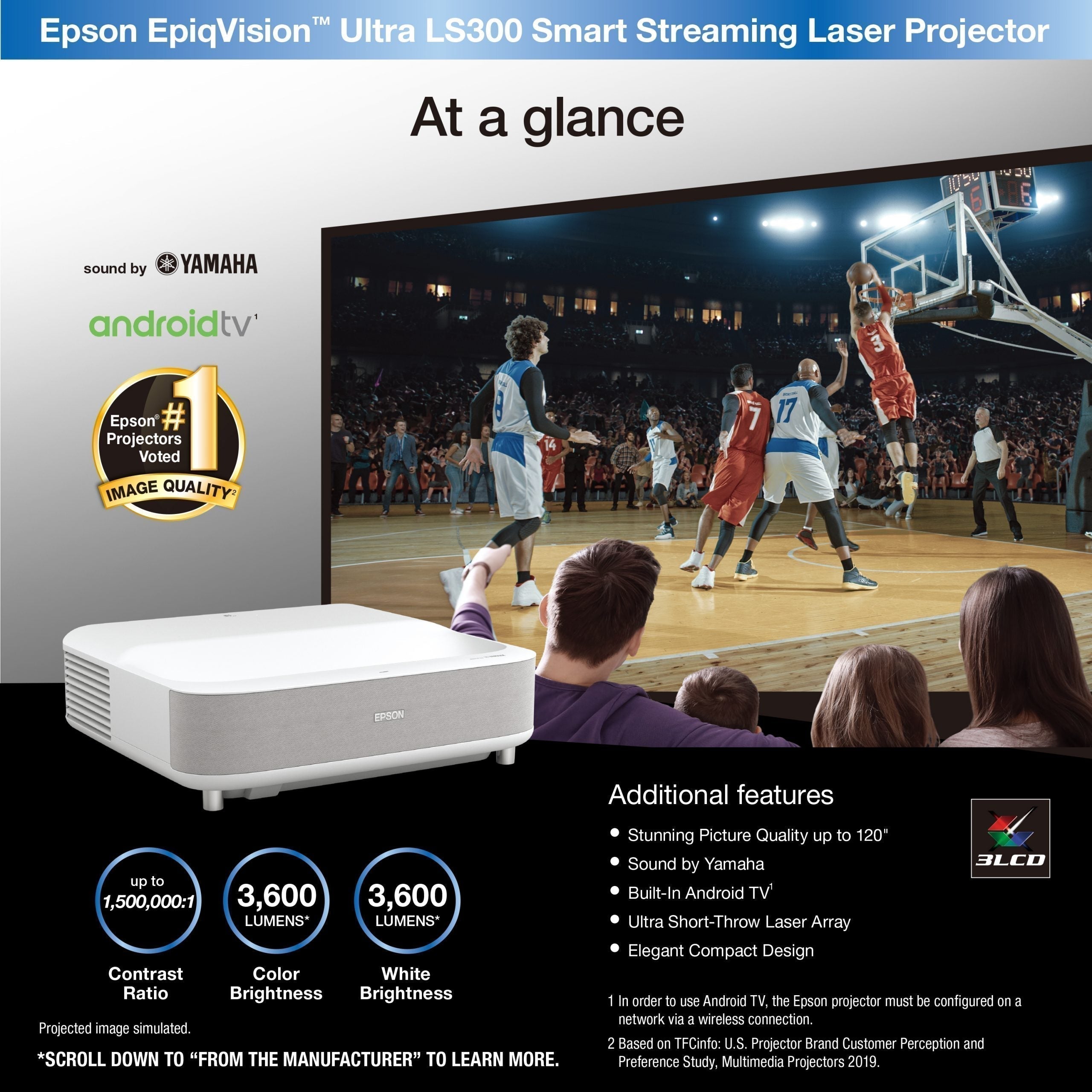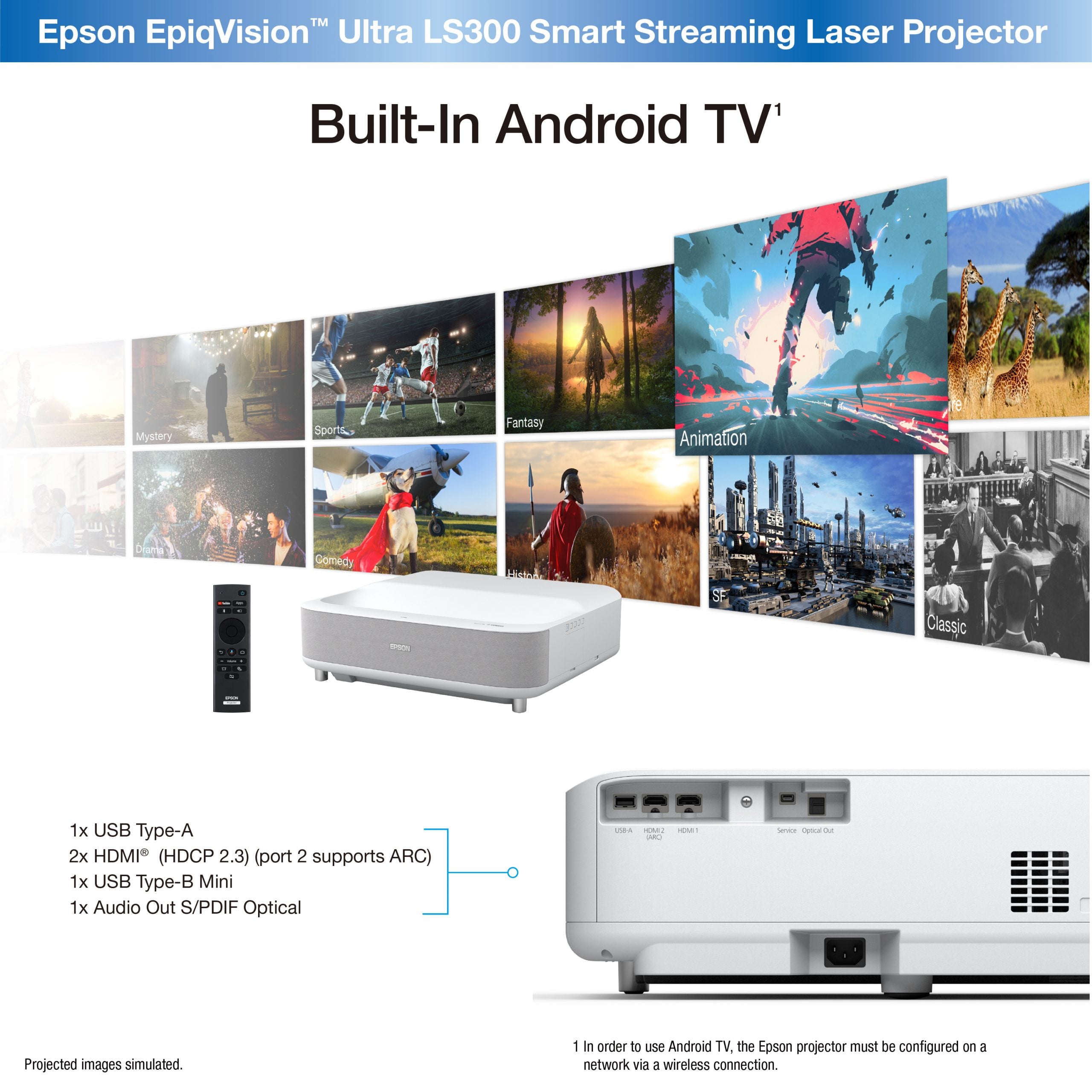 Epson EpiqVision Ultra LS300 Short Throw Smart Streaming Laser Projector with HDR1, Android TV, Sound by Yamaha, 3600 Lumens Color Brightness, 3600 Lumens White Brightness, Screenless TV, White