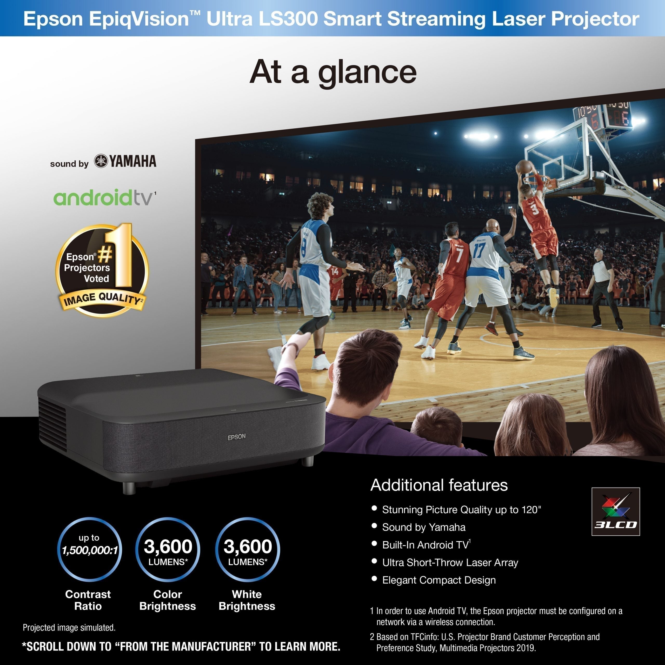 Go Epic! Immerse yourself in a new type of streaming experience with the Epson EpiqVision Ultra LS300 Smart Streaming Laser Projector. Utilizing an advanced, ultra-short throw design, viewing content has never been easier. Simply place the projector just inches from the wall and watch TV shows, sports, movies and more up to an astonishing 120″. Featuring built-in Android TV and wireless connectivity, the Epson EpiqVision LS300 Streaming Laser Projector gives you seamless access to popular streaming services including Hulu, HBO and YouTube, right out of the box. So, whether you’re binge-watching your favorite TV shows or hosting movie night, the Epson EpiqVision LS300 Streaming Laser Projector makes it easy to stream bright images virtually anywhere in your home. Audiophile 2.1 Speaker System by Yamaha. Epson has partnered with Yamaha to create a unique audio experience unlike anything it its class. Developed exclusively for the Epson EpiqVision LS300 Streaming Laser Projector, Yamaha’s leading Acoustic Engineers designed a unique 2.1 sound system to deliver a true audiophile performance. Designed within a custom 3D Acoustic Enclosure, two high-end Yamaha drivers and a dedicated woofer are powered by a discrete amplifier and tuned, using Yamaha’s latest AudioEngine™ DSP technology to produce an impressive, deep and wide sound stage that rivals dedicated higher-end audio systems and soundbars.