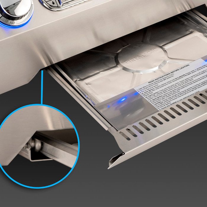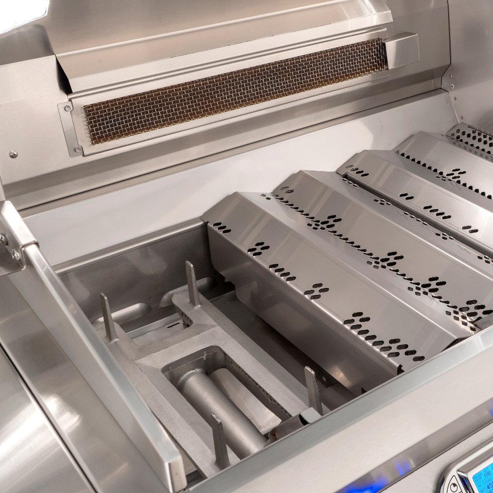 When only the best will do, the top of the line Fire Magic Echelon grill combines the ultimate in performance, beauty and innovation. With sleek lines, a unique contoured face and state of the art features such as hot surface ignition, blue back lit knobs, and Quantum backburner. Echelon Diamond defines luxury in grilling. Featuring 792 square inches of cooking space, this 36-inch gas grill has patented Diamond Sear cooking grids with 304 stainless steel bars that have a smooth flat top, shaped to optimally transfer the heat from the burners to the cooking surface so food cooks faster and more evenly! The Flavor Grids are made of 16-gauge 304 stainless steel and allow heat to rise unobstructed from the burner to cooking grids. They disperse heat quickly and evenly flavor the food by vaporizing juices and minimizing flare ups. The three(3) thick cast 304 stainless steel burners boast 96,000 BTUs of cooking power and are guaranteed for life. The recessed infrared quantum backburner uses 100-percent stainless steel foam, providing 13,000 BTUs of heat for quicker, more efficient rotisserie grilling with the included rotisserie kit. Enhance the flavor of the food you grill with the included stainless steel charcoal smoker basket that sits on top of the burner easily igniting the charcoal or wood chips. Lighting your grill is easy with the comfort touch back-lit polished knobs and included hot surface ignition for a reliable start. Control your grill with the state-of-the-art electronic thermometer display, which allows you to operate all cooking zones at one temperature, or control each zone independently to grill a variety of foods at once. The digital display also allows you to check the status of the included meat probe or turn on the interior halogen lights. Keep an eye on your food without letting any heat escape with the Magic View window, a ceramic glass window built into the double-lined hood.