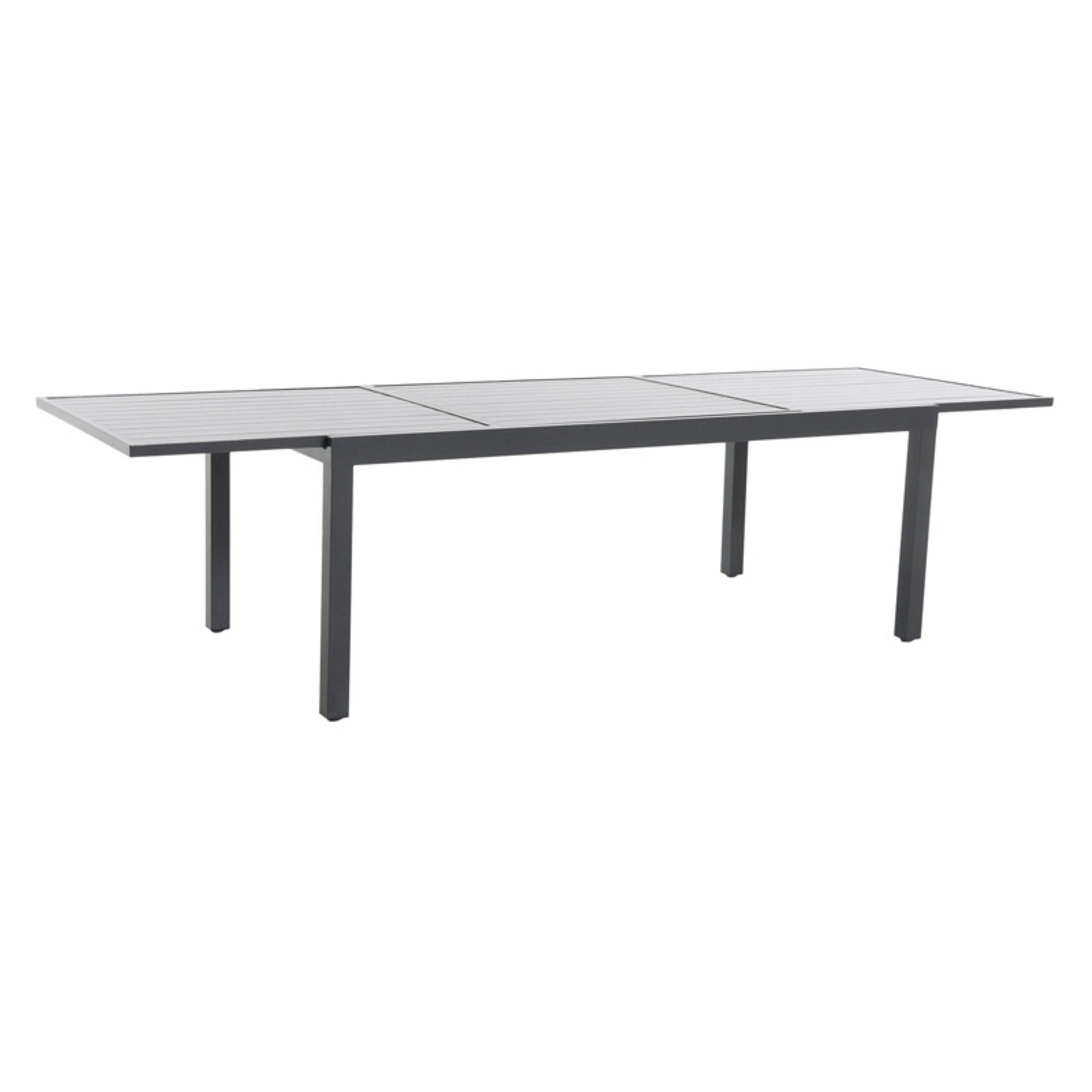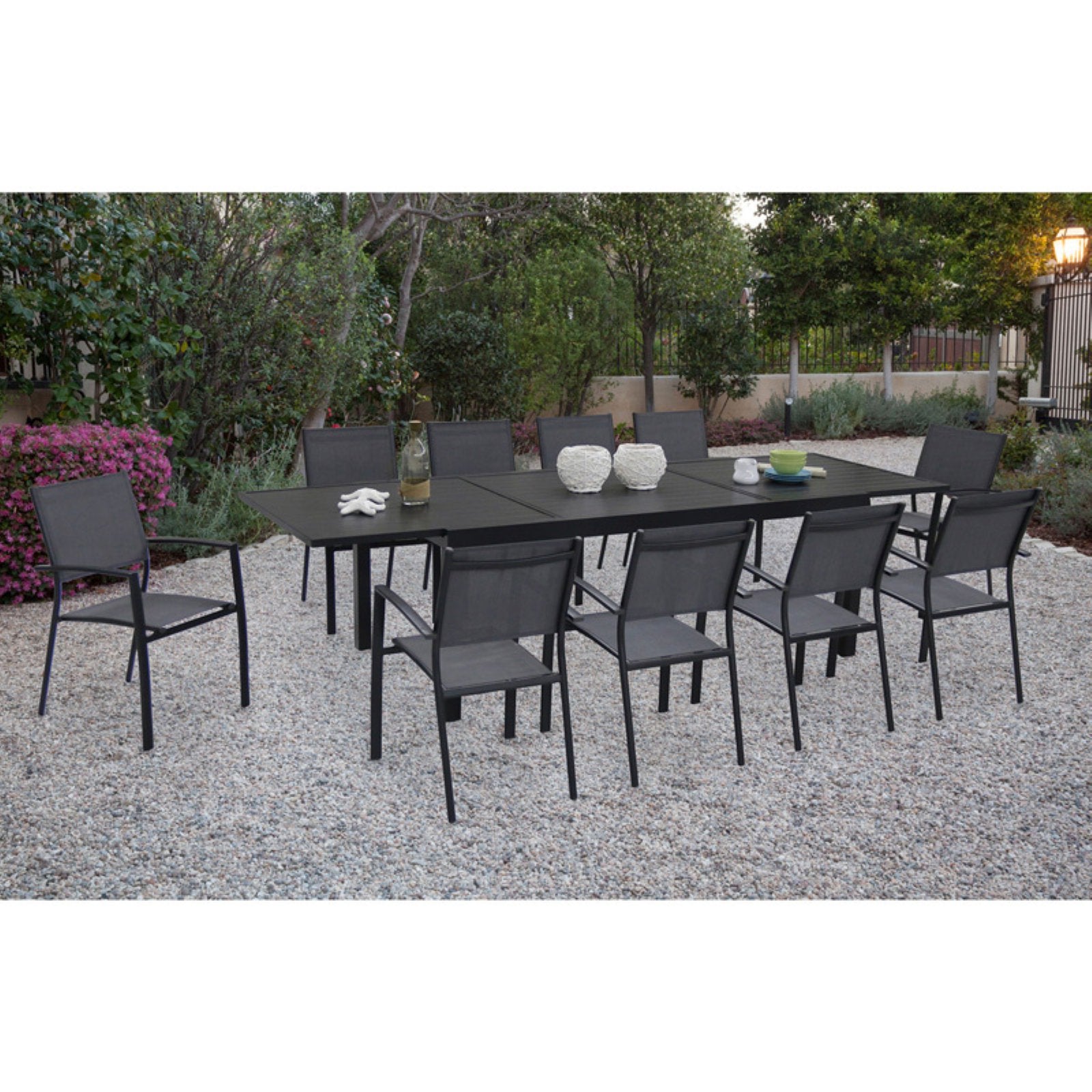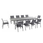 Express your sense of style with the cool and comfortable 11-Piece Dining Set from Hanover’s Naples Collection. This crowd-pleasing set includes an extra-long dining table and ten sling-back dining chairs built for all-season comfort. The cool grey tones omit a contemporary vibe that blends seamlessly into any location. The table-top expands by sliding outward, extending up to an impressive 118-inches for further accommodation. Both inviting and sophisticated, the set’s chic design will create a charming dining space in any outdoor setting. The set’s chairs are stackable for easy storage and is a breeze to clean and maintain. Weather and wear are no match for this dining set’s premium all-weather construction.