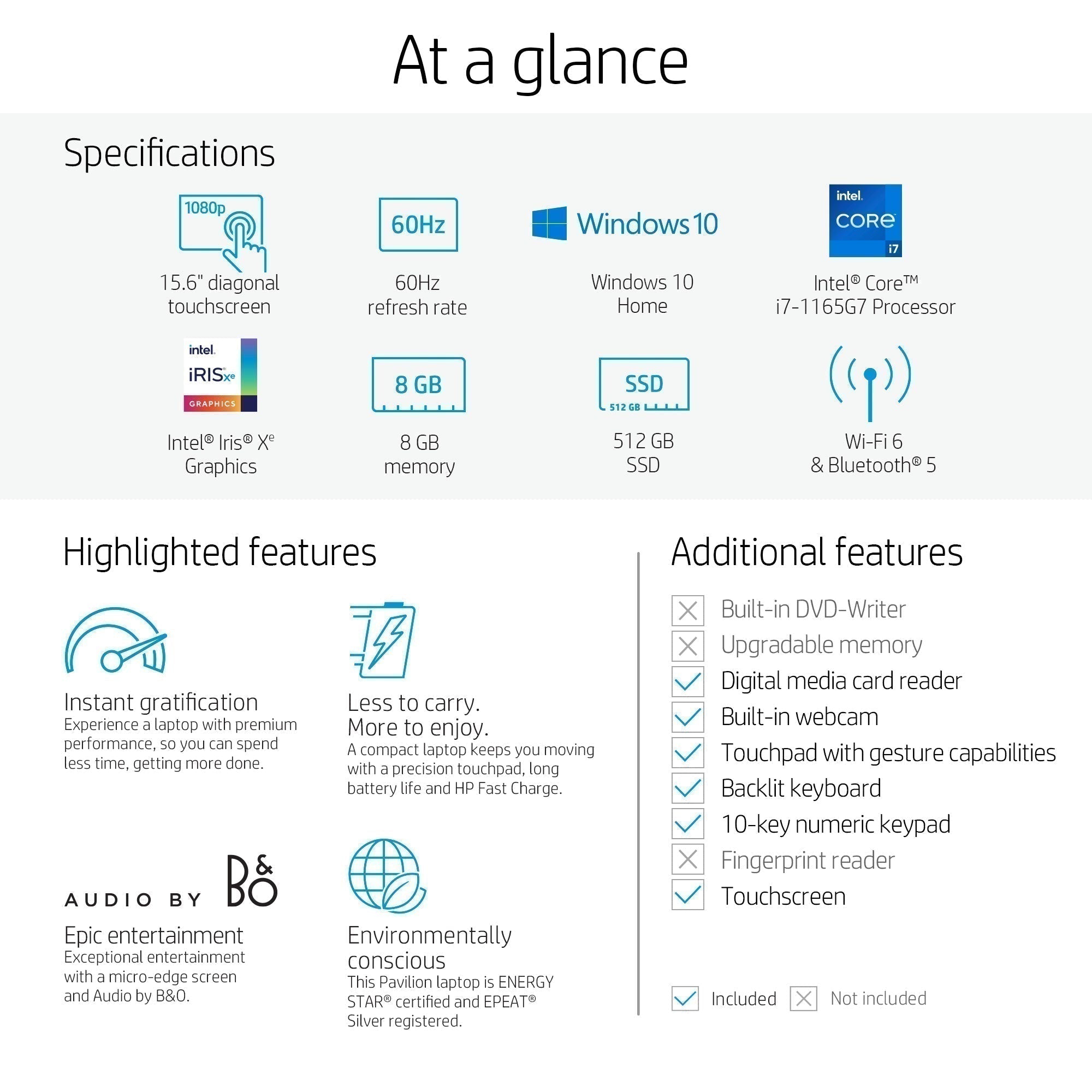 Enjoy incredible performance in a smaller PC and mind-blowing entertainment with a micro-edge screen and Audio by B&O. Intuitively reach out and control your display with just a touch. And transform your content with amazing Full HD detail and 178-degree wide-viewing angles, with Intel Iris Xe graphics for creating, gaming and entertainment. Enjoy crisp, stunning visuals with the convenience of a thin and light laptop for the home office. Keep your data and documents secure with patented 3D fingerprint reader that locks and unlocks your notebook with the touch of your finger. Adaptive Battery Optimizer protects battery health and brings peace of mind for uninterrupted productivity and entertainment with automatic checks on battery temperature, charging status, and usage time. With HP QuickDrop to make file transfers easy, fast and reliable, you can transfer photos, videos, documents and more between your PC and mobile device. Easily snap a photo to share, send addresses for directions on-the-go, and view texts on your PCs screen. No matter what your daily schedule looks like, the 11th Generation Intel Core processor brings the perfect combination of features to make you unstoppable. Get things done fast with high performance, instant responsiveness and best-in- class connectivity. The Windows 11 upgrade will be delivered to qualifying devices late 2021 into 2022. Timing varies by device. Certain features require additional hardware (see aka.ms/windows11-spec).