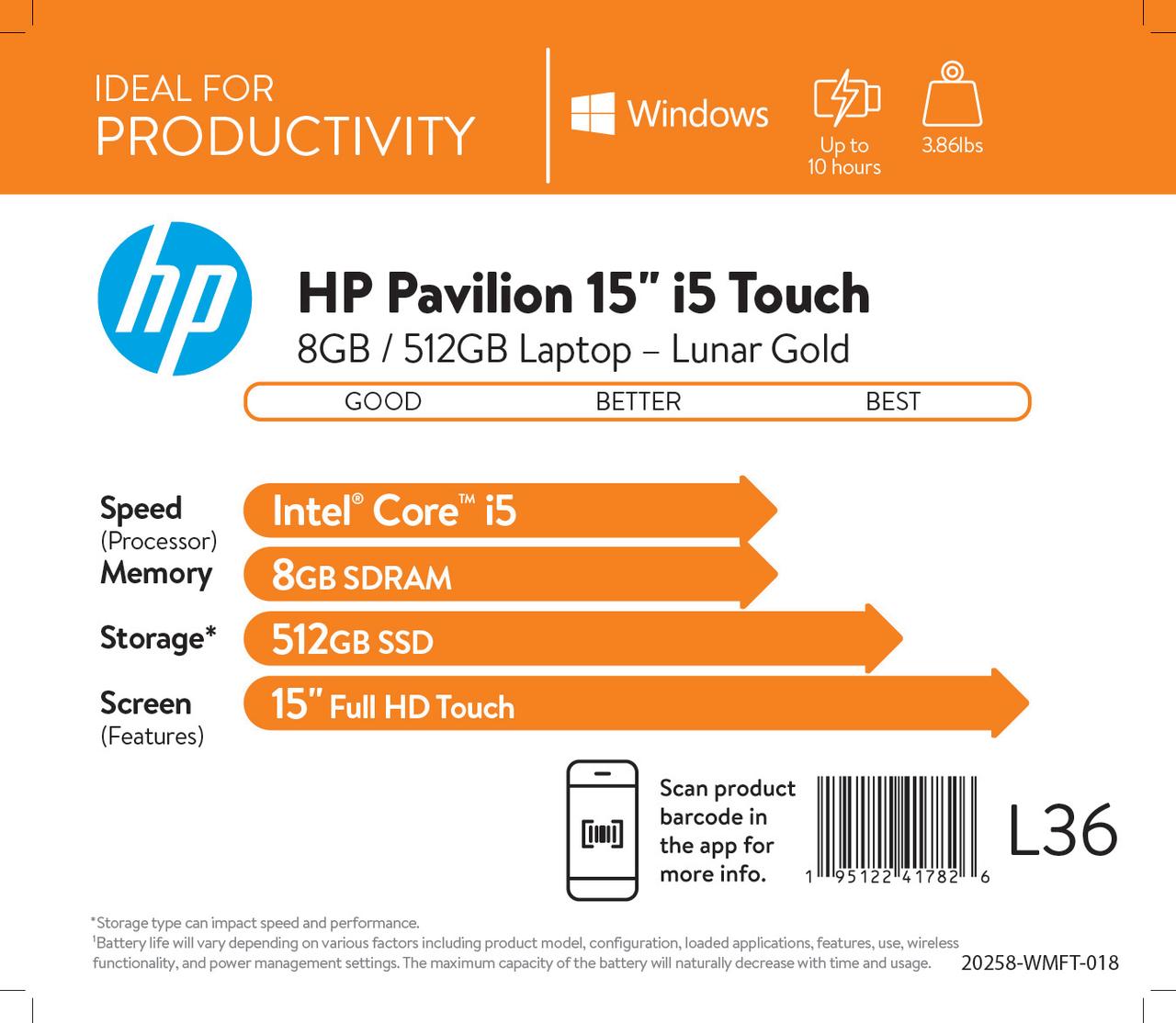 HP Pavilion 15.6″ FHD Touch, Intel Core i7-1165G7, 8GB RAM, 512GB SSD, Lunar Gold, 15-eg0070wm