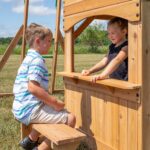 The majestic Backyard Discovery Montpelier Swing Set creates the ultimate outdoor playground for epic backyard adventures. This wooden swing set features a spacious upper clubhouse complete with a peak roof, full front door, and charming bay windows to create a dreamy playhouse space with plenty of style. The working door leads out to the balcony, which is the perfect launch pad for zooming down the 8-foot super speedy slide or testing skills on the monkey bars. Both the monkey bars and a step ladder offer fun access points to the playset, while the heavy-duty belt swings and trapeze invite exciting swinging fun. For break time, kids can retreat to the snack bar stand with its built-in picnic bench for treats and juice breaks or enjoy the lower shaded sandbox area for imaginative sensory play. The versatile design encourages both active play and quiet moments throughout the day. Crafted from beautiful cedar wood, this outdoor swing set naturally resists decay for exceptional strength and durability. Enjoy peace of mind with our 5-year warranty and ready-to-assemble design, featuring guided installation through the interactive BILT® app. Transform your backyard into a magical play space with the Montpelier Swing Set, where endless adventures await.