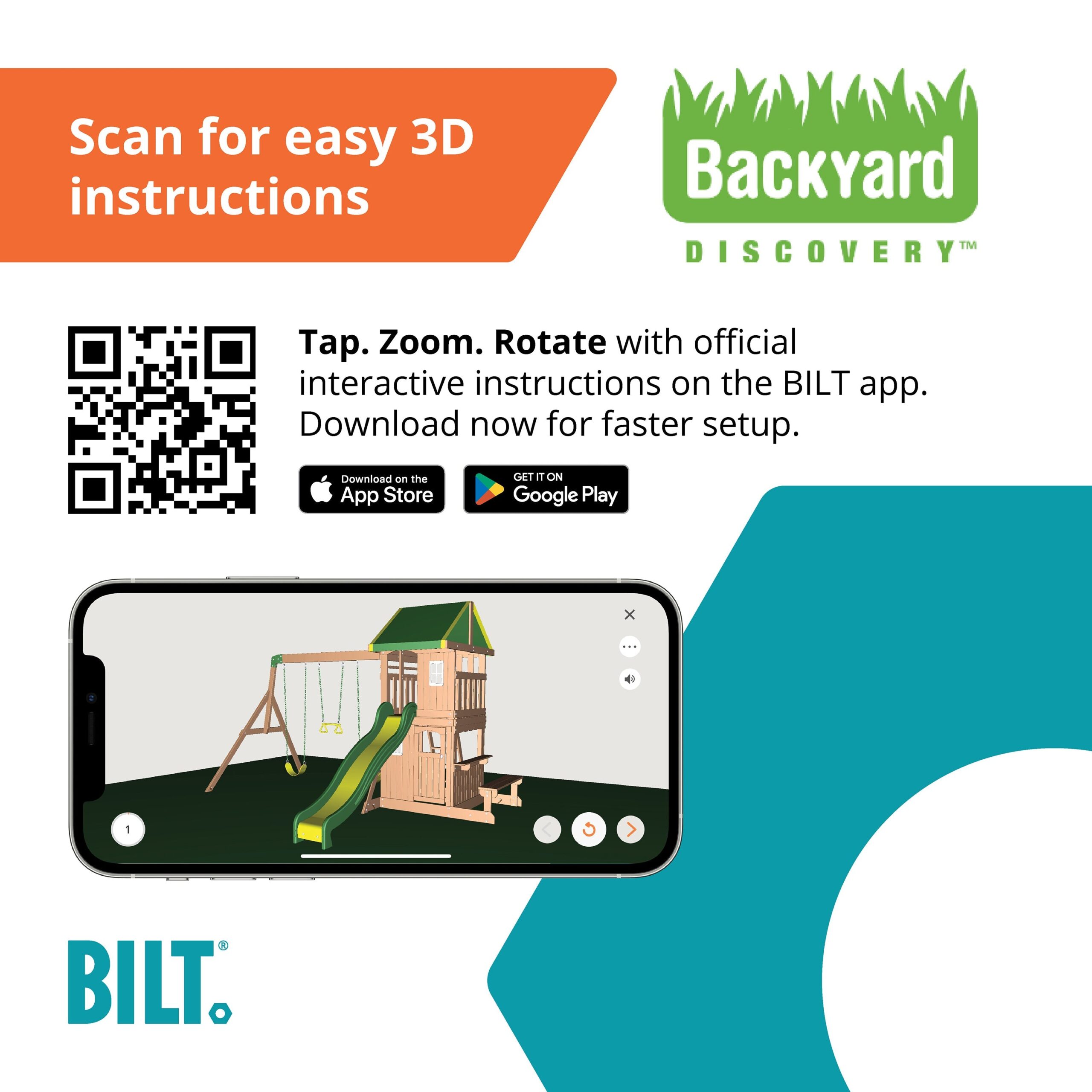 Designed to bring big fun to smaller backyards, the Oakmont Swing Set from Backyard Discovery unlocks a world of adventure. This adorable wooden swing set features an elevated clubhouse with a durable canopy roof and windows, becoming a hub of imagination that inspires creative play and endless storytelling. Nestled below, a charming playhouse invites little ones to step into their own world. A full front door opens to a space with a snack bar window, while the exterior built-in bench offers the perfect spot for friends to gather and enjoy treats or a play time break. Two classic belt swings and a trapeze bar invite children to soar and play together, creating moments of joy and friendship. The wide rung flat step ladder provides easy access to the upper clubhouse, while the speedy 8-foot wave slide delivers thrilling rides that spark excitement and laughter. Crafted from naturally durable cedar wood, this outdoor playset stands ready to withstand years of active play. The thoughtfully designed roof offers shade while maintaining excellent visibility, giving parents peace of mind during backyard adventures. Ready to assemble with guided BILT® app instructions, the Oakmont Swing Set turns any backyard into an exciting playground of possibilities.