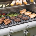 - Four(4) 8,000 BTU gas burners, provide evenly-distributed heat across a 670 square-inch cooking surface. An adjustable, stainless steel warming rack folds down to keep foods warm and can be folded away for additional space when using the included stainless steel rotisserie spit motor and spit rod (rotisserie kit sold separately).