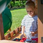 Double the fun with Backyard Discovery’s Tacoma Falls Swing Set, a versatile outdoor playground delivering an adventure-packed experience. This stylish wooden playset features an upper clubhouse and a lower playhouse, each designed to spark imagination and creativity. The clubhouse feels like home with charming windows, a wooden roof, and a built-in chalkboard that’s perfect for budding artists. A crow’s nest lookout with a toy telescope invites little explorers to embark on imaginative journeys, while the two exciting slides offer thrilling rides to the ground. A twisty spiral tube slide and speedy wave slide provides endless fun for adventurous kids. The lower playhouse offers a world of wonder and discovery. Kids can enter through the full front door and step into their own play kitchen, where battery-powered accessories and a toy sink let them prepare pretend meals and ring the dinner bell to call in friends. Two belt swings and the web disc swing create sky-high adventures, while the rock wall and step ladder offers multiple ways to the clubhouse. Crafted from natural cedar, this wooden swing set is built to create lasting memories. It’s ready to assemble, and the BILT® app instructions simplify setup to ensure years of outdoor play.