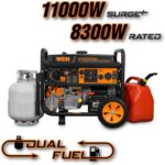 - Switch between gasoline (11,000 surge watts, 8,300 running watt) and propane (9,500 surge, 7,500 running) with the simple turn of the selection dial