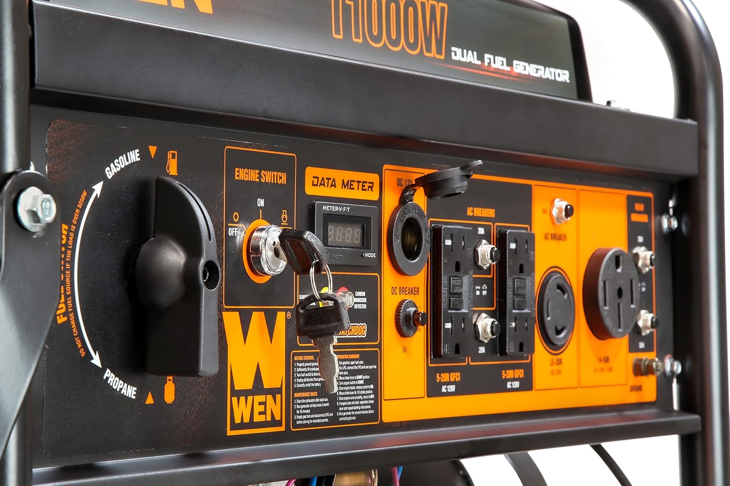 Remember when you could run your generator off either gas or propane? Whether we’re providing your home electricity during a crisis or charging your family’s cellphones at the campgrounds, WEN has been reliably lighting up lives since 1951. Now, with the WEN 11,000-Watt Dual Fuel Electric Start Generator, you’ll be able to create power from two different sources. Simply select your preferred method, either gasoline or LPG, and power on the generator using the electric start. Propane provides the generator with 9,500 surge and 7,500 running watts while gasoline creates up to 11,000 surge and 8,300 running watts. Our packed panel features four 120V GFCI outlets (5-20R), a 120V 30A twist lock outlet (L5-30R), a 120V/240V 50A outlet (NEMA 14-50R), and a 12V DC cigarette-lighter-style plug. Run your lights, TV, refrigerator, sump pump, power tools, or other essentials with ease. The wheel and handle kit makes transportation easier than ever while the included 47-inch LPG hose allows for immediate connection to propane tanks. With its 240 volts of power and 457cc engine, this generator is the perfect companion for emergency back-up. Simply plug your transfer switch into the NEMA 30A twist lock for electricity in times of need. Fill the gas tank with up to 6.6 gallons of gasoline for an 8.5-hour half-load runtime. It’s durable enough for the job site and compact enough for easy storage. And because its a WEN product, your generator comes backed by a nationwide network of skilled service technicians, a friendly customer support phone line, and a two year warranty. Remember when you didn’t have to worry about the power going out? Remember WEN.