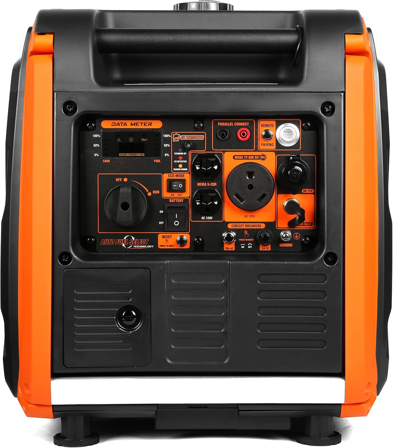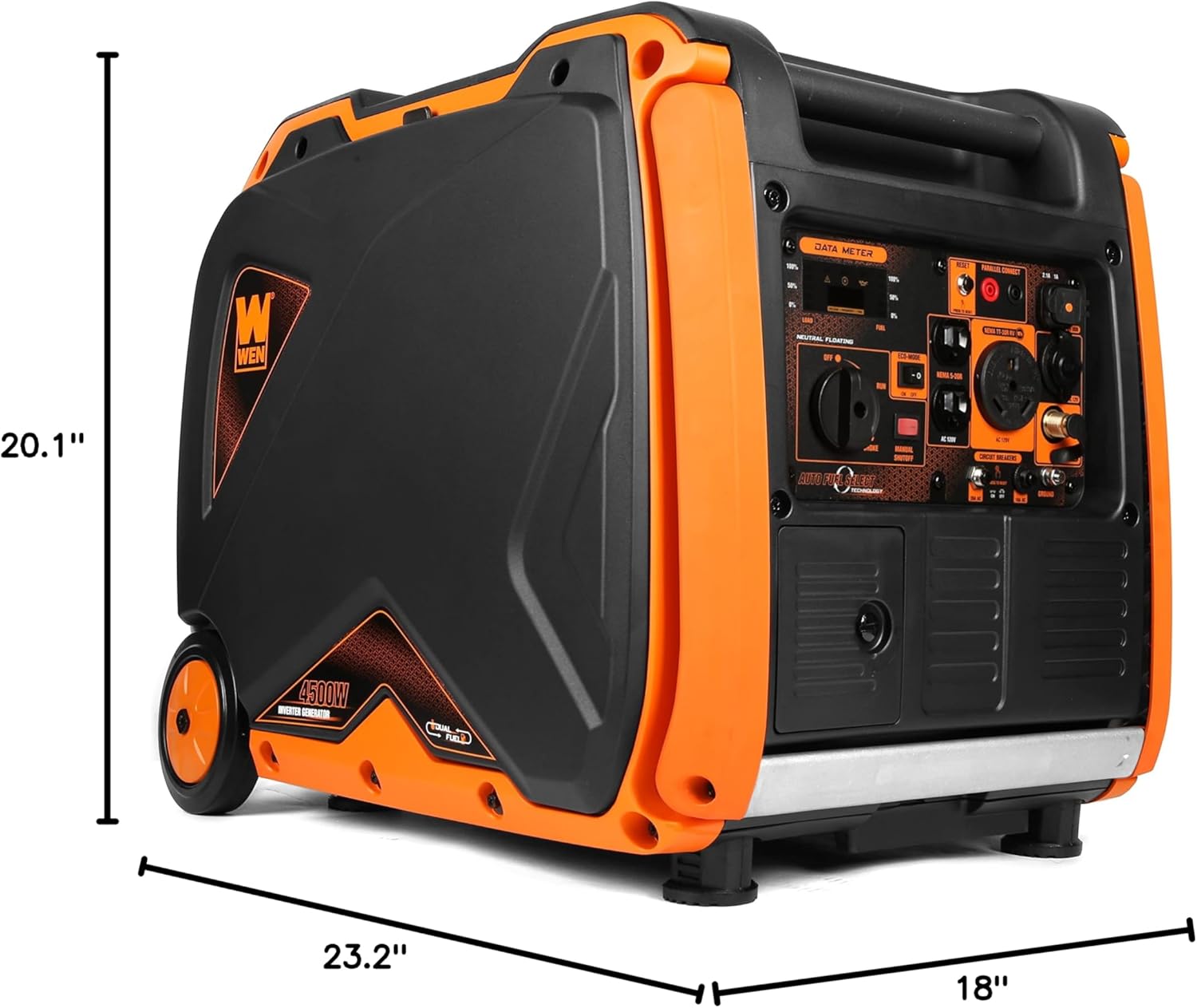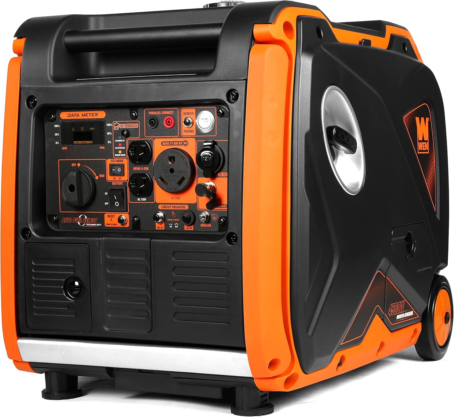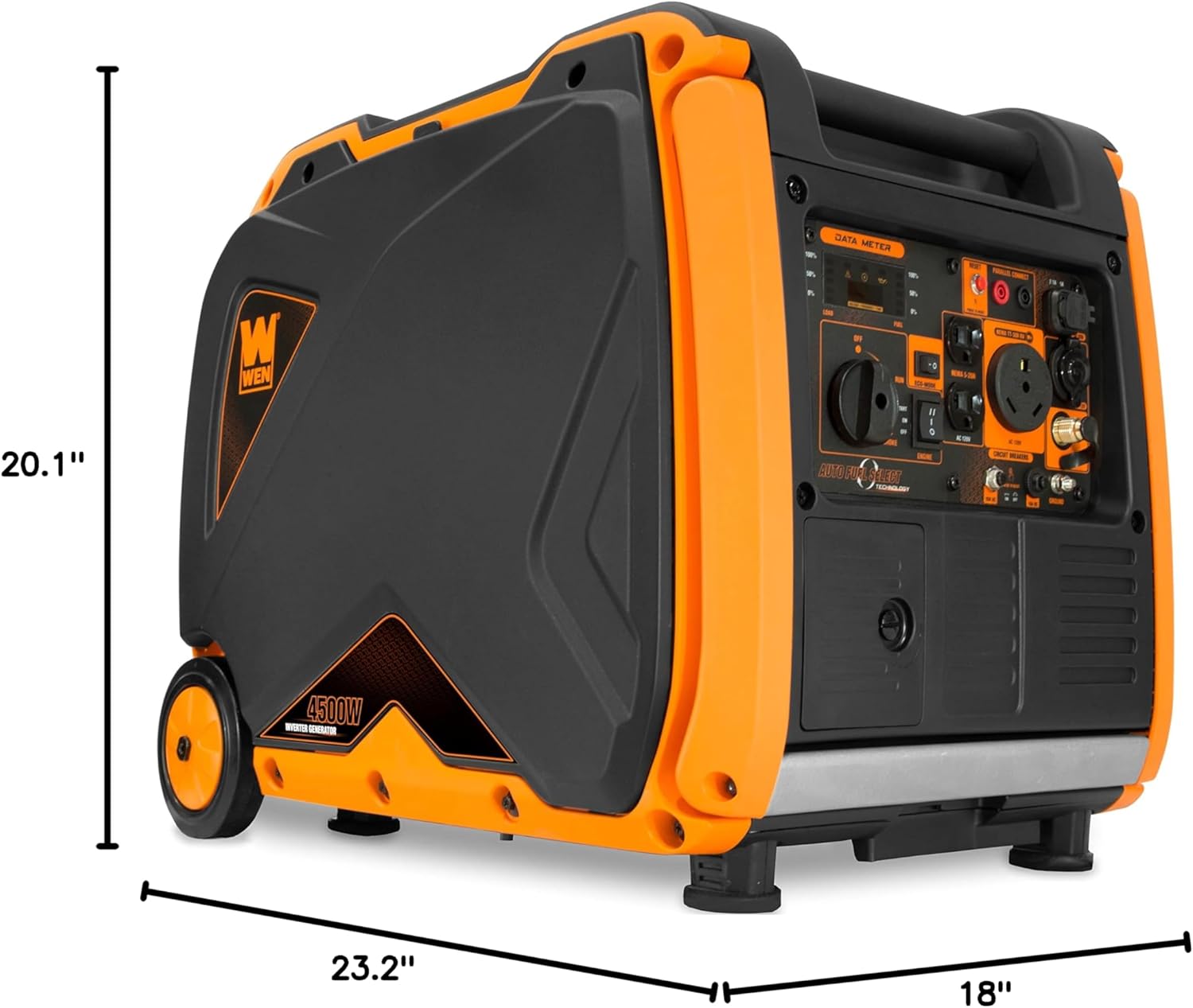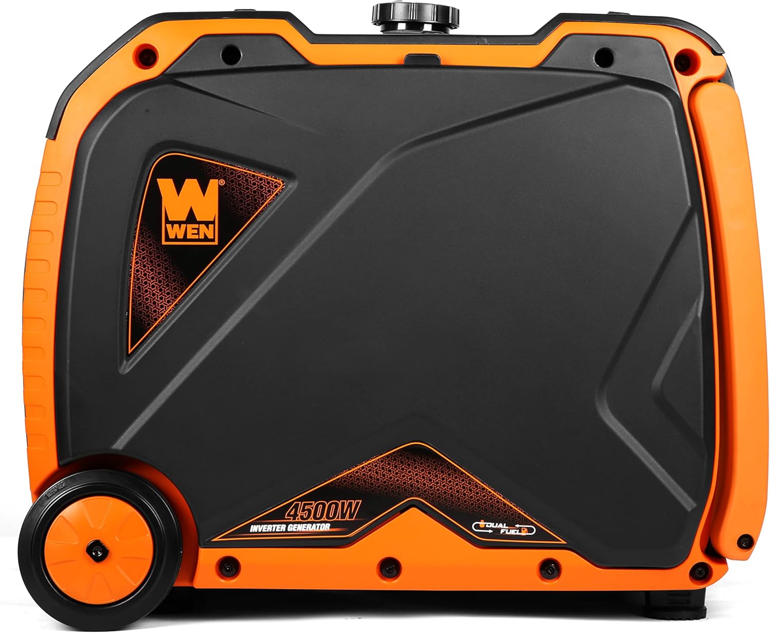 Remember when you had clean and quiet portable power? The WEN 6800-Watt Inverter Generator provides clean energy, free of voltage spikes and drops, without all the noise of a regular generator. Produce up to 6800 surge watts and 5100 rated watts of power on gasoline, or connect a propane tank using the tool-free quick-connector for up to 6000 surge watts and 4500 rated watts of power on LPG. The keyless electric start lets you turn on your generator at the press of a button, and includes a recoil starter as backup. The WEN Watchdog CO Shutdown Sensor helps protect both you and your family by automatically turning off the generator if dangerous levels of carbon monoxide are detected. Our 224cc engine operates at a modest 64 decibels at quarter load. This limits its invasiveness while camping, hunting, tailgating, and restoring backup power. The WEN 6800W Inverter Generator is also equipped with fuel shutoff. This feature turns off the flow of fuel, allowing for the generator to use up the remaining fuel from the carburetor before automatically shutting down. This helps fight the build-up and blockages caused by stagnant fuel inside of the carburetor, minimizing maintenance while prolonging the unit’s lifespan. Designed to mirror a pure sine wave, this generator limits total harmonic distortion to under 0.3 percent at no load and under 1.2 percent at full load, making it safe to run laptops, cellphones, monitors, tablets and other sensitive electronics. The built-in wheels and telescoping handle make for easy portability while the ultra-efficient 2.9-gallon tank provides up to 6.1 hours of half-load run time (or 9 hours half-load run time on a 20-pound LPG tank). The fully-packed panel comes equipped with one 120V/240V NEMA transfer-switch or electric-vehicle-ready L14-30R receptacle, two three-prong 120V NEMA 5-20R receptacles, one 12V DC receptacle, one 120V TT-30R RV receptacle, a voltage selector switch, and two 5V USB ports. Maximize fuel economy by engaging the eco-mode switch. This allows the generator’s engine to automatically adjust its fuel consumption as items are plugged into and unplugged from the panel, preventing the unnecessary usage of gasoline. Need more energy? Easily link up any two 240V WEN inverter generators using a WEN 240V Parallel Connection Kit (sold separately) in order to share wattage amongst multiple units. Low-oil and low-fuel automatic shutdown combine with the built-in overload protection and indicator lights to safeguard both your generator and your electronics from damage. The bonded-neutral 240V configuration provides low-power Level 2 battery EV charging for peace of mind when your electric vehicle is off the grid. And because this is a WEN Product, your inverter generator comes backed by a 3-year limited warranty, a nationwide network of skilled service technicians, and a friendly customer helpline. Remember when your generator powered your electronics safely and quietly? Remember WEN.