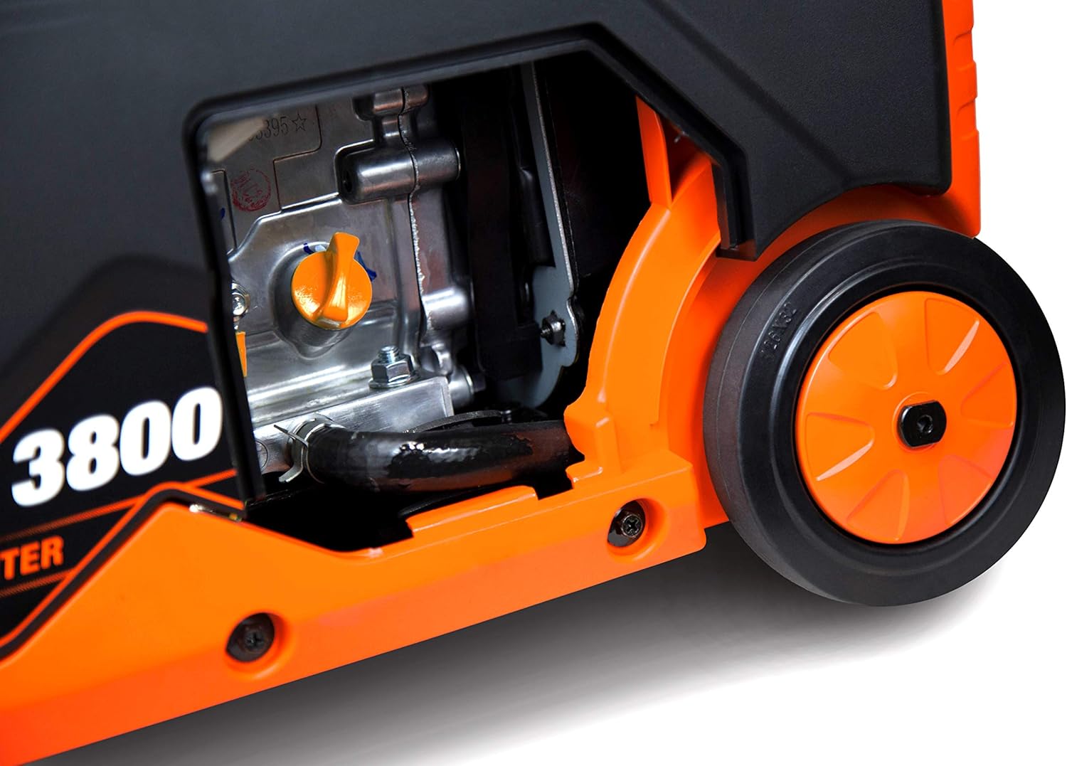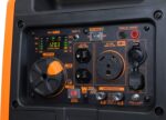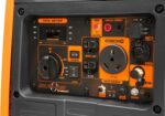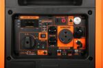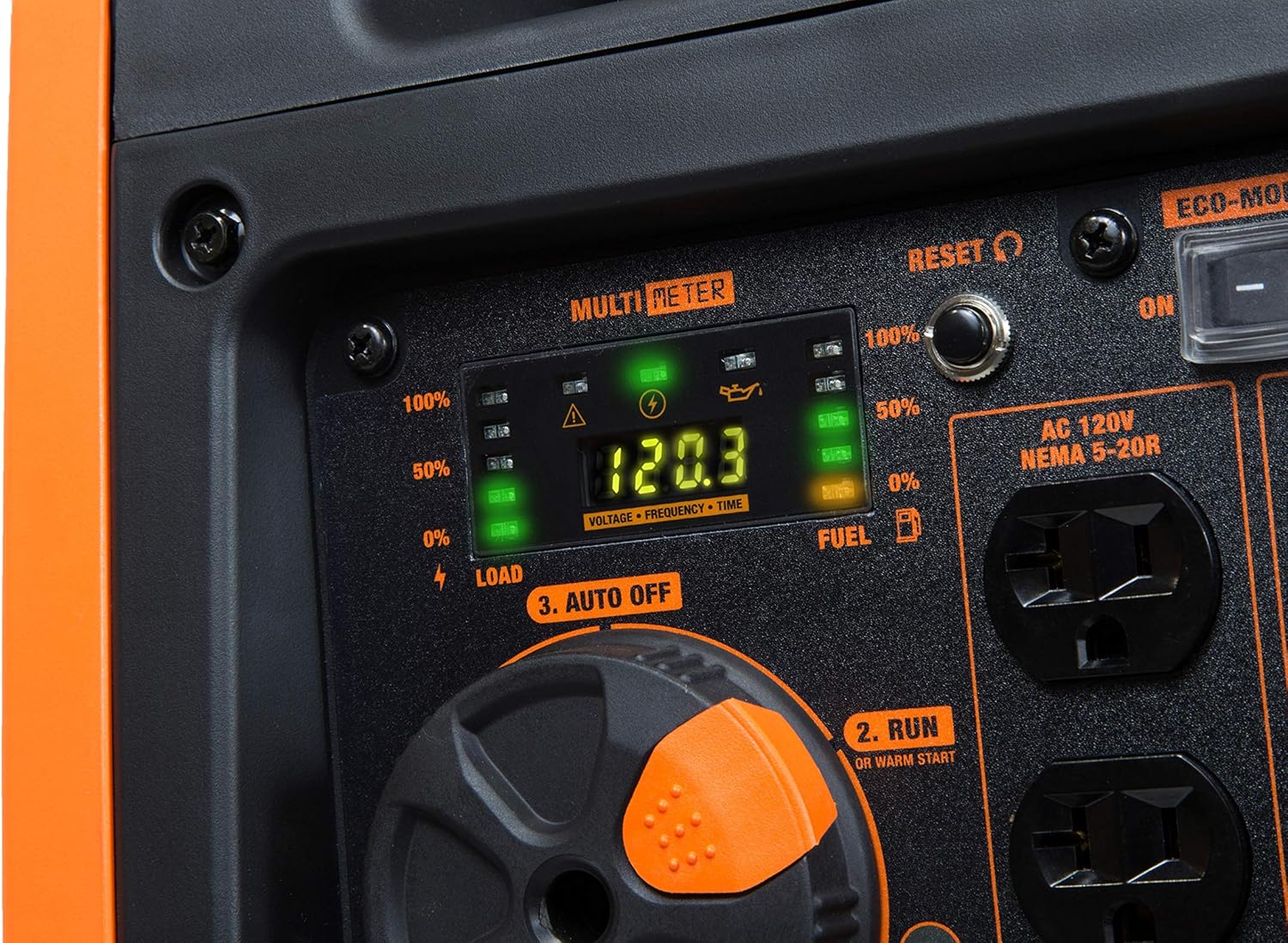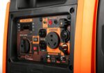 - Includes fuel shut-off to help limit maintenance, onboard wheels, a telescoping pull handle, one L14-30R 120V/240V receptacle, two three-prong 120V receptacles, one TT-30R RV receptacle, one 12V DC receptacle, two 5V USB ports, a voltage selector switch, a tool-free LPG quick-connector, a six-foot-long LPG regulator hose, and a three-year warranty