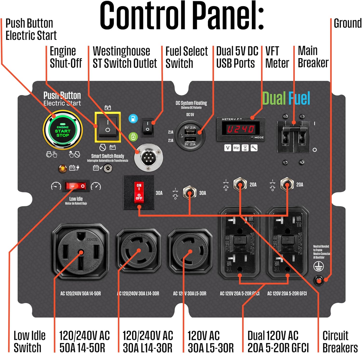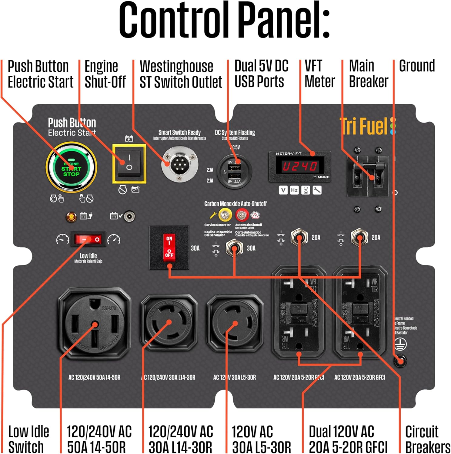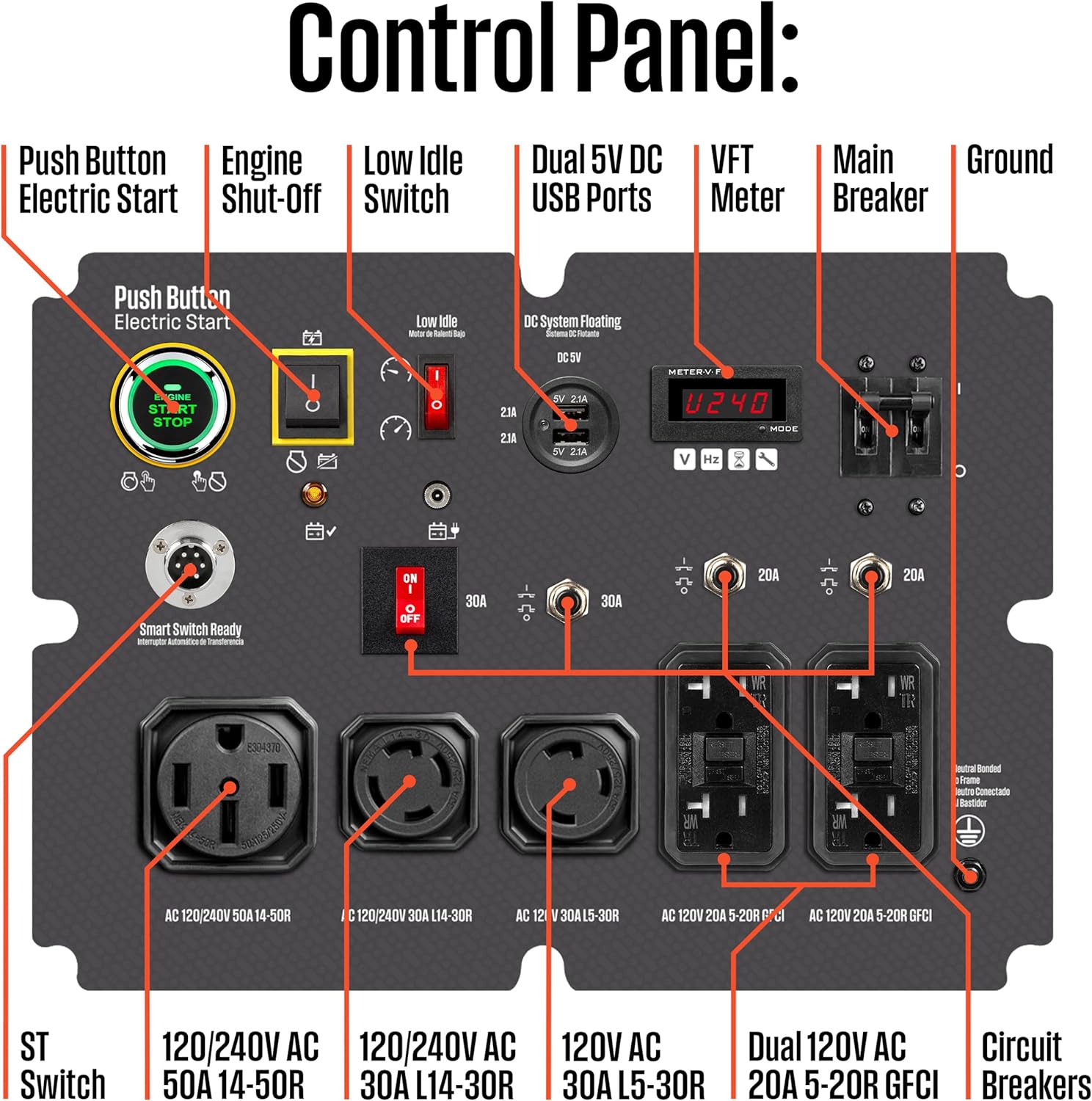 • Features Two GFCI 120V 5–20R Standard Household Receptacles, One 120V L5-30R Outlet, One Transfer Switch Ready 120V L14-30R, One RV Ready 120/240V 14–50R, and Two 5V USB Ports; All Outlets Have Rubber Covers for Added Safety