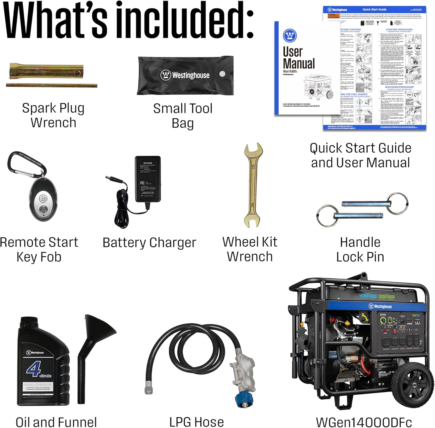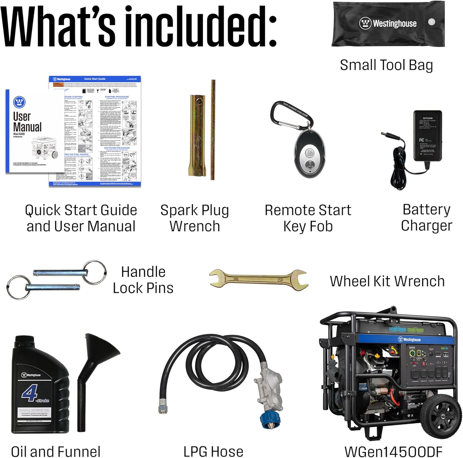 For your toughest power needs, the Westinghouse WGen14500DF Dual Fuel Portable Generator is an ultra duty generator engineered for strength. With 18,000 peak watts and 14,500 running watts, the WGen14500DF is built with a brawny 713cc V-Twin OHV Westinghouse Engine to yield up to 11 hours of run time on a 10.5 gallon (40 L) gas tank and operates on either gasoline or propane. It features Push-Button Electric Start, making starting the WGen14500DF effortless while the remote start key fob offers added ease from a distance. Transfer Switch Ready L14-30R 30A and larger 14-50R 50A outlets have the muscle to power all your major appliances like your air conditioner, refrigerator and sump pump as well as lights or entertainment centers at the same time with a single cord hookup. At less than 5% THD, the WGen14500DF allows you to safely and easily power sensitive electronics like computers, phones and TVs. Copper windings help the unit produce cleaner power, run cooler and last longer. The VFT Data Center displays real-time performance information to keep you up to date with regular maintenance. Constructed with a rugged steel frame with lift brackets, the WGen14500DF is also conveniently portable with an included set of heavy-duty never-flat wheels and handles to have your house, travel trailer, or job site powered in seconds. The WGen14500DF is complete with a 3-Year Limited Warranty and Lifetime Technical Support backed by our nationwide customer service and support network.