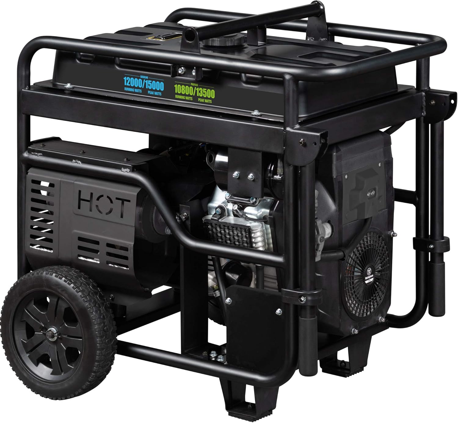 • Gasoline: 14500 Running Watts and 18000 Peak Watts; Propane: 13000 Running Watts, 16000 Peak Watts; Electric Start and Remote Start with Included Key Fob; Up to 11 Hours of Run Time on a 10. 5 Gallon Fuel Tank with Fuel Gauge