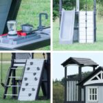 Combining charm and adventure, the Whispering Point Swing Set creates a dreamy backyard playground. This wooden swing set is crafted from durable cedar wood and offers a multi-level play experience. The spacious upper clubhouse features charming bay windows, while its crow’s nest lookout includes a toy telescope for spotting backyard adventures. Budding chefs can whip up imaginary feasts while friends eagerly await their creations in the fully equipped play kitchen below, complete with a toy stove, sink, faucet, and variety of other play accessories. An exciting rock wall and a rope climbing wall provide exciting ascents, while a step ladder ensures safe and easy accessibility for all skill levels. Kids can enjoy the two belt swings or zip down the 8-foot speedy wave slide for active outdoor fun. Thrill-seekers will love sky-high adventures on the web swing, offering a fun way to swing and soar. The BILT® app provides guided instructions while the ready-to-assemble design makes setting up your kids’ swing set a breeze. Plus, our 5-year warranty offers peace of mind for years of outdoor enjoyment. With Backyard Discovery’s Whispering Point, watch as your children’s creativity and confidence reach new heights in this stylish and feature-packed playhouse swing set.