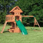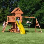 Enjoy the enchanting charm of a forest cottage with Backyard Discovery’s Woodland Swing Set, where magical outdoor adventures come to life. The beautiful upper clubhouse features a peak roof and whimsical diamond-shaped peepholes that create a storybook hideaway inspiring imaginations. Little explorers will love scaling the daring rock wall that challenges their climbing skills or taking the kid-friendly flat step ladder for easier accessibility. Beneath the clubhouse, an octagon-shaped play space captures the essence of a fairy tale playset. An adorable half door opens to a snack bar serving station featuring three built-in seats, transforming into a cozy café where friends gather for snack time or arts and crafts. Kids can zoom down the 10-foot speedy wave slide from the clubhouse and race to the two classic belt swings for sky-high adventures. Aspiring gymnasts will delight in practicing acrobatic skills on the trapeze, adding an extra layer of fun to playtime. Crafted from naturally durable cedar, this premium wooden swing set ensures exceptional strength and resistance to weather, providing a play structure that will withstand countless childhood adventures. It’s ready to assemble and offers BILT® app guidance, promising to create a magical backyard playground where childhood memories bloom like wildflowers.